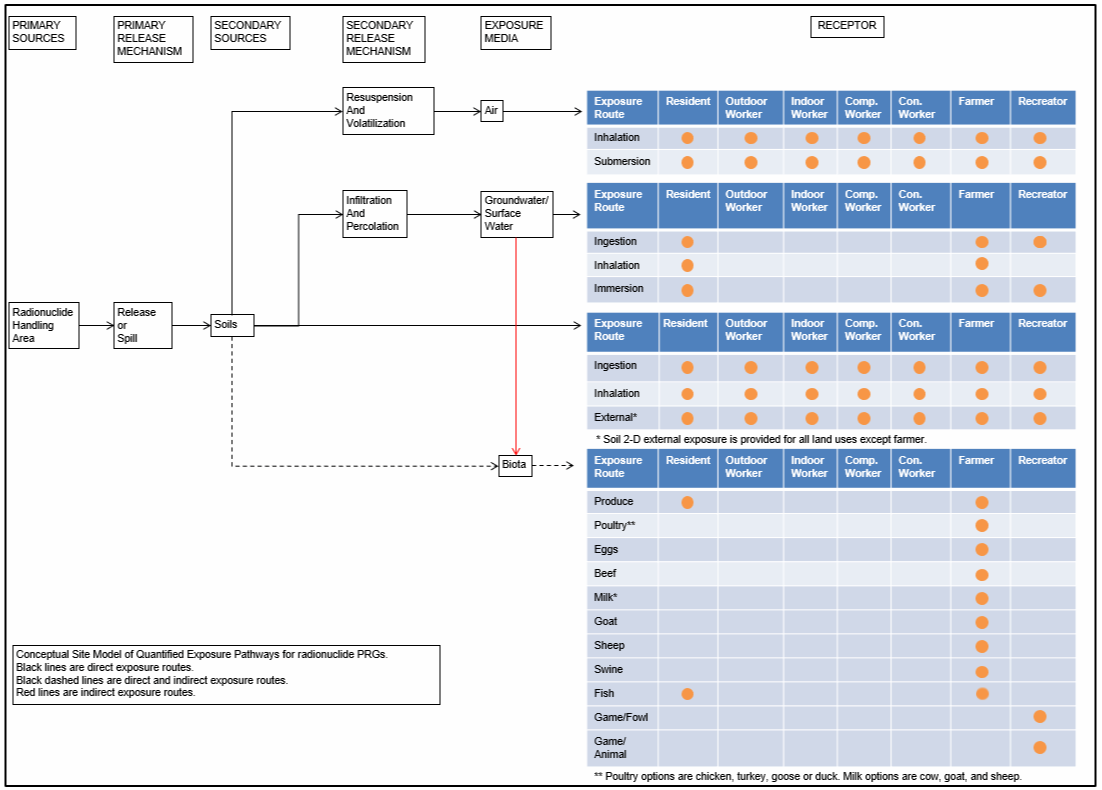 This website combines current Center for Radiation Protection Knowledge SFs with standard exposure factors to estimate contaminant concentrations in environmental media (biota, air, soil, and water) that are protective of humans (including sensitive groups) over a lifetime. Sufficient knowledge about a given site may warrant the use of site-specific assumptions that may differ from the defaults. Exceeding a PRG usually suggests that further evaluation of the potential risks is appropriate. The PRGs presented on this website can be used to screen pollutants in environmental media, trigger further investigation, and provide initial cleanup goals, if applicable. PRGs should be applied in accordance with guidance from EPA Regions.
